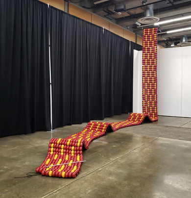 This work is also meant to confront the viewer, to force them to move around it in the gallery space, to reclaim that space, if only temporarily, as Indigenous land. Each row is comprised of thirteen beads; a call-back to the lunar calendar that the Bitterroot Salish people followed. The design of yellow beads within the red is a nod to the use of dashes in ledger art to indicate foot steps.